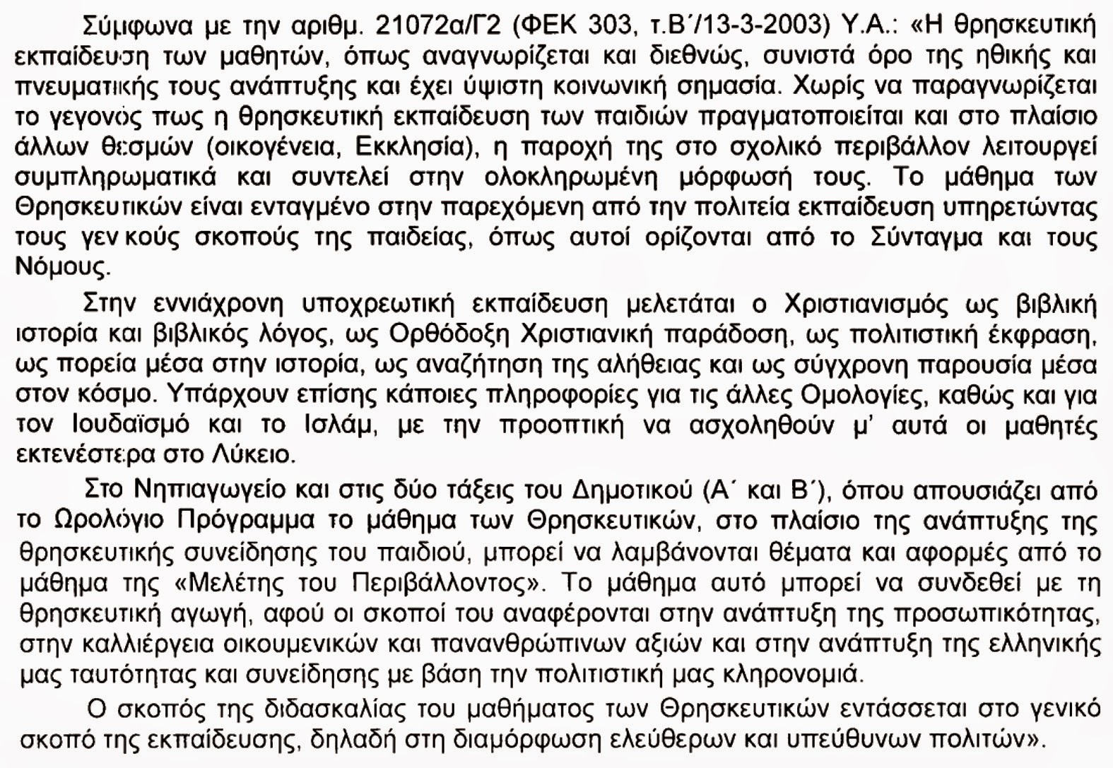 μαθητῶν ἀπό τό μάθημα τῶν Θρησκευτικῶν» χωρίς, ὅμως, νά προσθέτη καμμιά διευκρίνηση